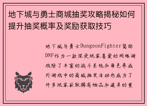 地下城与勇士(Dungeon & Fighter,简称DNF)作为一款深受玩家喜爱的网络游戏,除了丰富的战斗系统和角色养成外,游戏中的商城抽奖活动也成为了许多玩家获取稀有物品和道具的重要途径之一。虽然商城抽奖充满了随机性和惊喜,但如何提升抽奖的概率,获得更多的奖励,成为了不少玩家关心的话题。本文将通过四个方面的分析,详细揭秘地下城与勇士商城抽奖的攻略,帮助玩家们提高抽奖的效率,获取更丰厚的奖励。